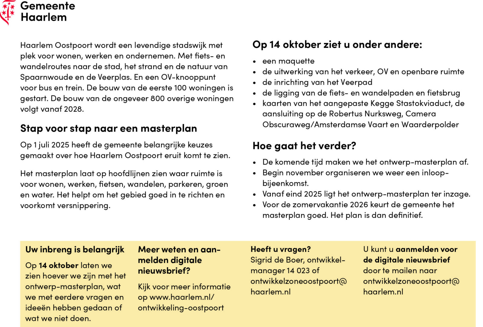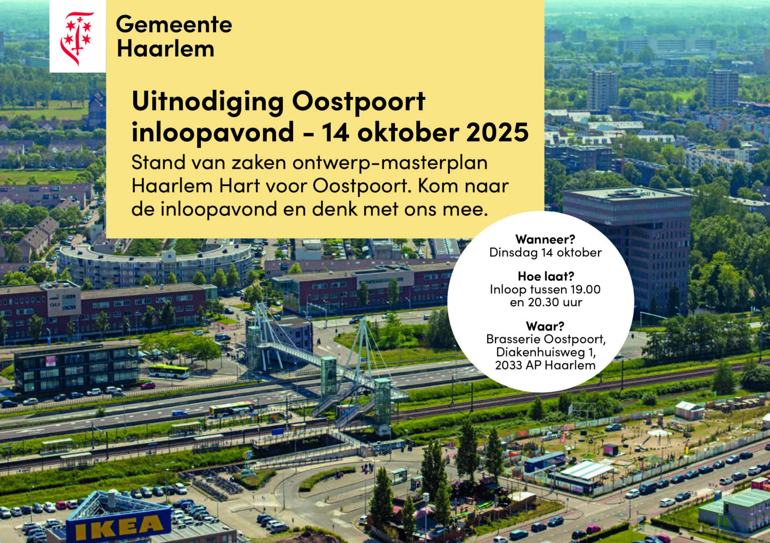 publicaties UITNODIGING INLOOPAVOND OOSTPOORT, dinsdag 14 oktober 2025 webmaster 6 oktober 2025 Stand van zaken ontwerp masterplan Hart voor Oostpoort. Kom naar de inloopavond en denk mee. Inloop van 19:00 tot 20:30 uur in Brasserie Oostpoort, Diakenhuisweg 1, 2033 AP Haarlem. About the Author webmaster Administrator View All Posts Post navigation Previous: NIEUWSBRIEF 3 oktober 2025Next: UITNODIGING OPENBARE WIJKRAADVERGADERING, dinsdagavond 7 oktober 2025 Gerelateerde verhalen publicaties NIEUWSBRIEF 29 november 2025 webmaster 29 november 2025 0 publicaties NIEUWSBRIEF 31 oktober 2025 webmaster 31 oktober 2025 0 publicaties UITNODIGING RUIMTE IN OOST – KUNSTROUTE webmaster 19 oktober 2025 0