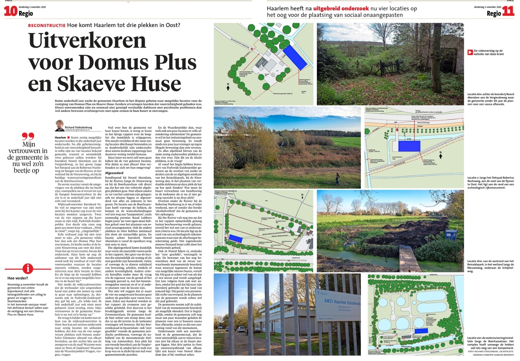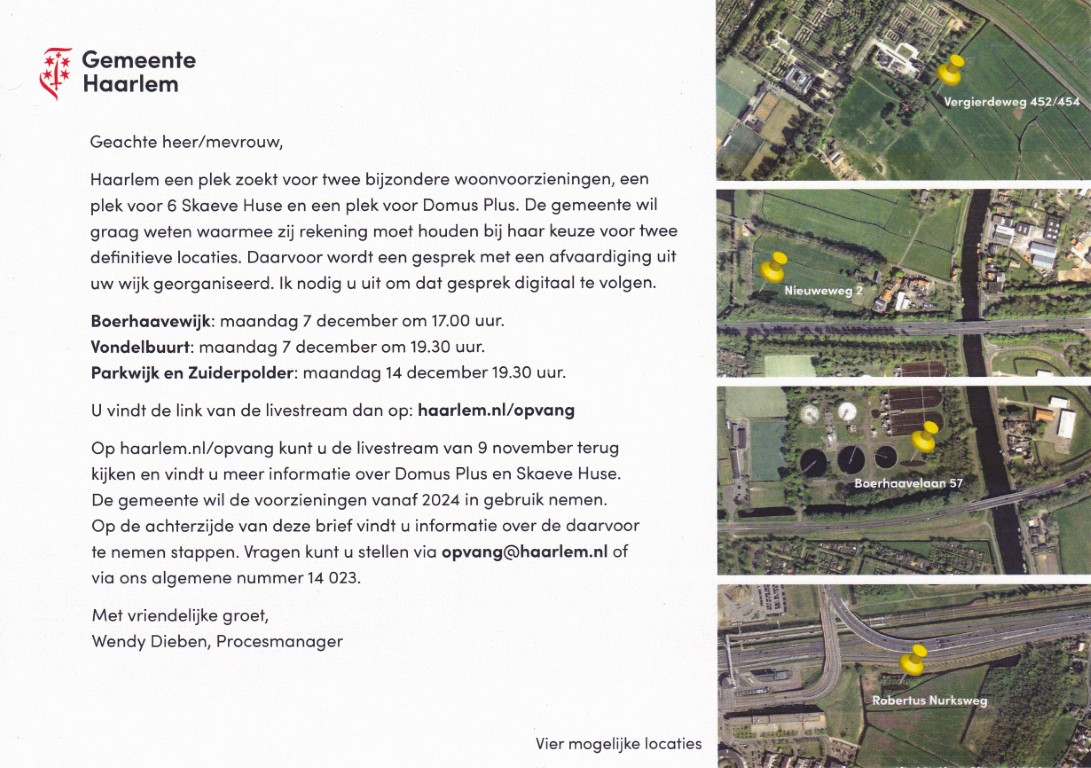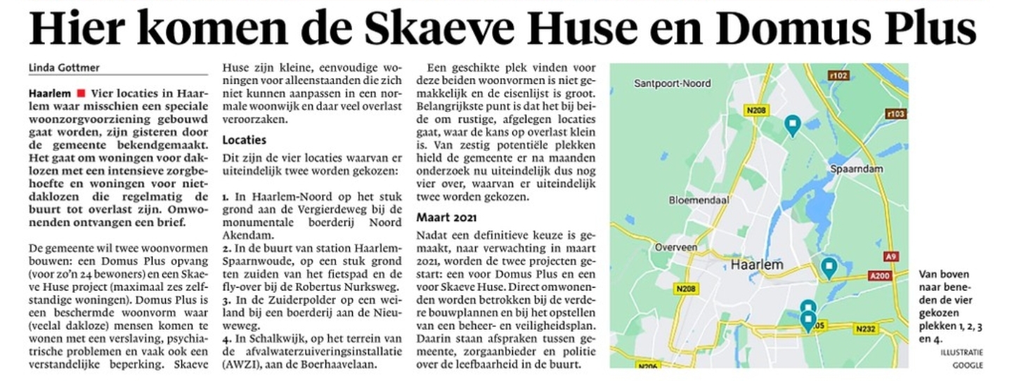 Tot 1 oktober 2019 konden Haarlemmers locaties voorstellen die naar hun mening geschikt zijn voor een Domus Plus of Skaeve Huse. Daaruit zijn 60 locaties in beeld gekomen en getoetst aan de criteria. Er zijn 4 mogelijke locaties overgebleven. Over deze locaties worden de komende maand gesprekken gevoerd met omwonenden.