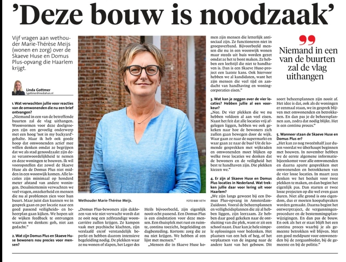 • Op 9 november is er een online bijeenkomst voor alle belangstellenden uit de omgeving van de 4 locaties. De bijeenkomst begint om 19:30 uur. Op deze bijeenkomst wordt uitleg gegeven over wat Domus Plus en Skaeve Huse inhoudt. Er wordt verteld hoe omgegaan wordt met aspecten rondom veiligheid en handhaving en wat de ervaringen in andere steden zijn met een dergelijke locatie. Tijdens de bijeenkomst kunt u online vragen stellen hierover.
