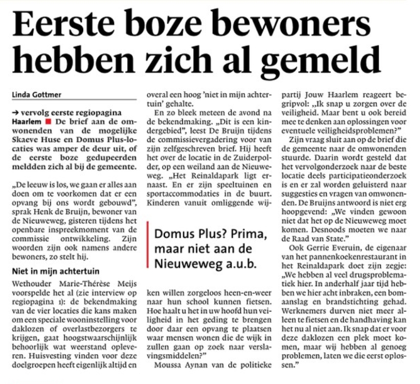 De bewoners vrezen voor hun veiligheid en woongenot, wethouder Roduner kwam tijdens de online bijeenkomst, 14-12-2020, met de mededeling, gemeente Haarlem kan GEEN GARANTIES geven!!!