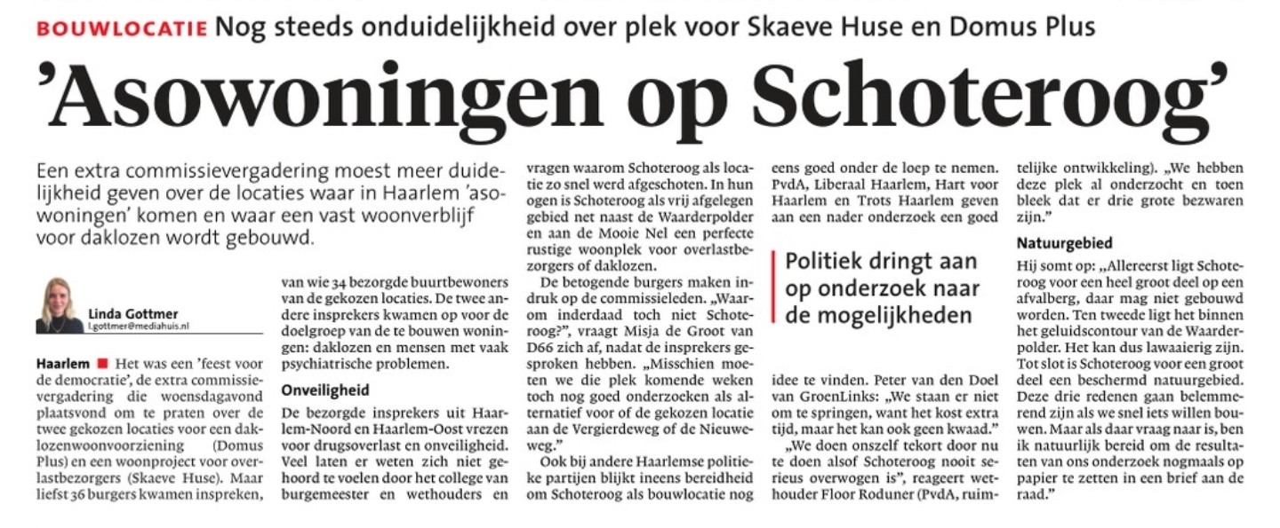 De gemeente Haarlem wil 2 woonzorgvoorzieningen bouwen: een Domus Plus en een project Skaeve Huse.
